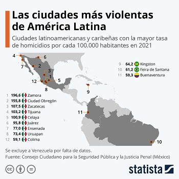 El Consejo Ciudadano para la Seguridad Pública y la Justicia Penal, una organización no gubernamental mexicana, publica todos los años un estudio sobre las ciudades más violentas del mundo. Según el nuevo reporte hecho público este mes, varias urbes situadas en México se ubican en las primeras posiciones de este infame ranking, al registrar las tasas de homicidios más altas de América Latina y del mundo en 2021. Así, Zamora, la tercera mayor ciudad del estado de Michoacán, lidera la lista con casi 197 homicidios perpetrados por cada 100.000 habitantes. Le sigue Ciudad Obregón, ubicada en el sur de Sonora, donde se registran cerca de 156 asesinatos por cada 100.000 personas. Zacatecas, capital del estado homónimo en el centro-norte de México, se sitúa en el tercer lugar, con una tasa de 107,5 homicidios.